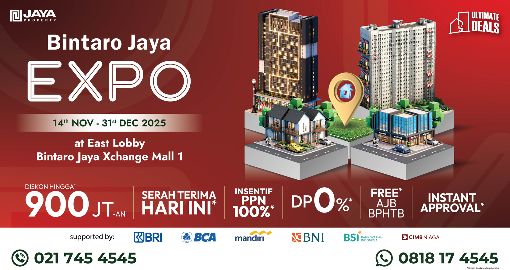 Expo ini menghadirkan berbagai promo menarik berjudul “Ultimate Deals”, dan khusus untuk hunian di Bintaro Jaya, pengunjung berkesempatan untuk mendapat harga special. Untuk unit Condominium harga mulai dari 400 Juta-an*, Cicilan mulai dari 2 Juta-an*, Siap Huni*, Free Furnish*, sementara penawaran menarik untuk Unit Rumah diskon hingga 900 juta*, cicilan hingga 60 kali*, free logam mulia*, Free AJB BPHTB*, Instant Approval* hingga kesempatan memenangkan Grand Prize Trip to Paris*. Ini menjadi kesempatan emas bagi masyarakat untuk melihat, merasakan, dan menemukan hunian berkualitas, sekaligus menjadi bagian dari generasi berkualitas yang tinggal di kawasan modern, strategis, dan terus berkembang di Bintaro Jaya.